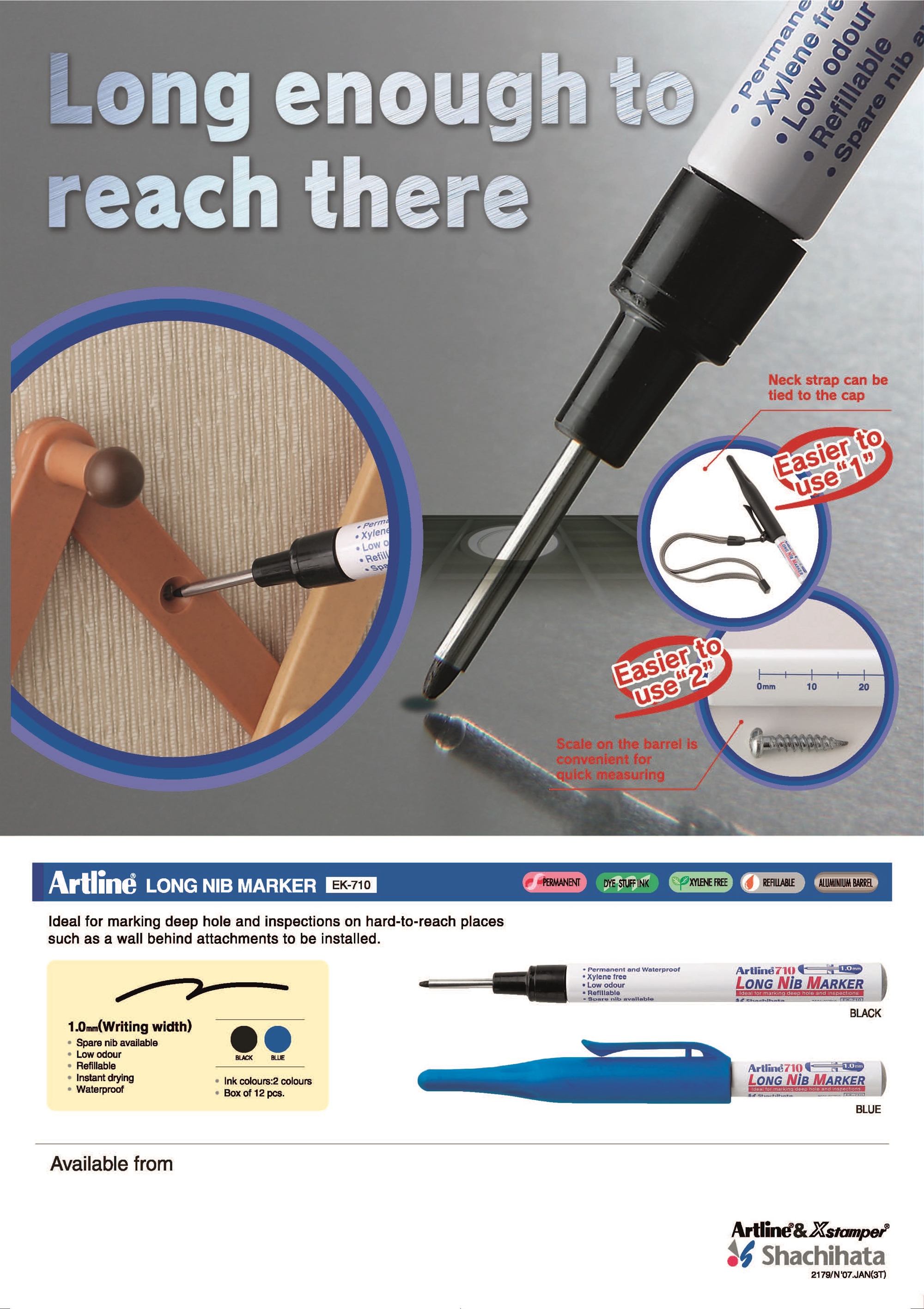 • Permanentinis žymeklis su 1 mm apvaliu pluoštiniu galiuku. 30 mm ilgio galiukas idealiai tinka žymėjimui skylėse. Žymeklis greitai džiūsta, yra atsparus vandeniui ir papildomas. Sudėtyje yra alkoholio pagrindu pagaminti permanentiniai dažai be ksileno.