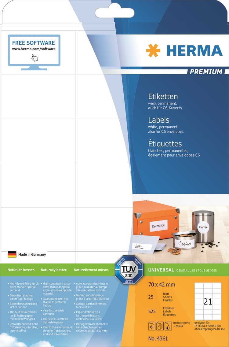 • Premium etiketės ant A4 lapų, tinkančios tiek rašaliniams, tiek lazeriniams spausdintuvams. Etiketės yra ekologiškos, ypač tvirtos ir nuolat prilimpančios. 21 etiketė viename lape, 25 lapai vienoje pakuotėje. Nemokama programinė įranga: www.herma.com/software.