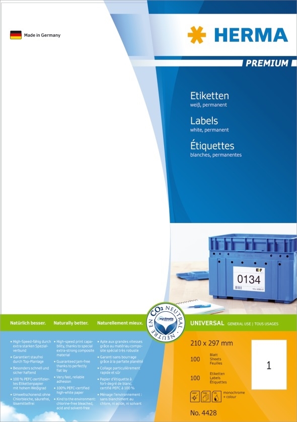 • Premium etiketės ant A4 lapų, tinkamos tiek rašaliniams, tiek lazeriniams spausdintuvams. Etiketės yra ekologiškos, itin tvirtos ir nuolat klijuojamos. 1 etiketė viename lape, 100 lapų pakuotėje. Nemokama programinė įranga: www.herma.com/software.