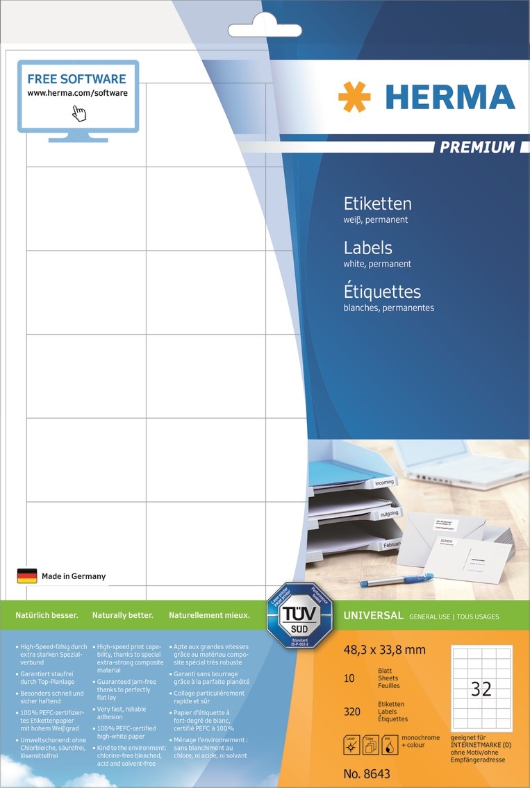 • Premium etiketės ant A4 lapų, tinkamos naudoti tiek rašaliniuose, tiek lazeriniuose spausdintuvuose. Etiketės yra ekologiškos, ypatingai tvirtos ir nuolat prilimpančios. Nemokama programinė įranga: www.herma.com/software.