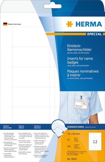 • Kartono įdėklai vardiniams ženkliukams ant A4 formato lapų - galima spausdinti tiek rašaliniais, tiek lazeriniais spausdintuvais, o lapai yra perforuoti ir lengvai tvarkomi. Idealiai tinka konferencijoms, kursams, seminarams ir t.t. Nemokamus programinės įrangos sprendimus galima rasti čia www.herma.com/software